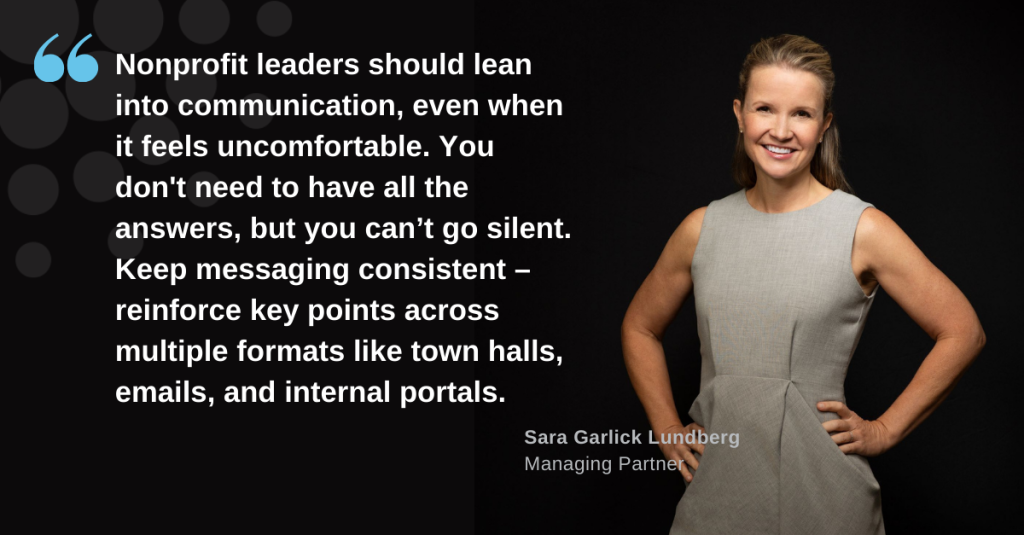 During uncertain times, many leaders hesitate to communicate. But when leaders withdraw, employees disengage and create their own narratives. Nonprofit leaders should lean into communication, even when it feels uncomfortable. You don’t need to have all the answers, but you can’t go silent. Keep messaging consistent – reinforce key points across multiple formats like town halls, emails, and internal portals.