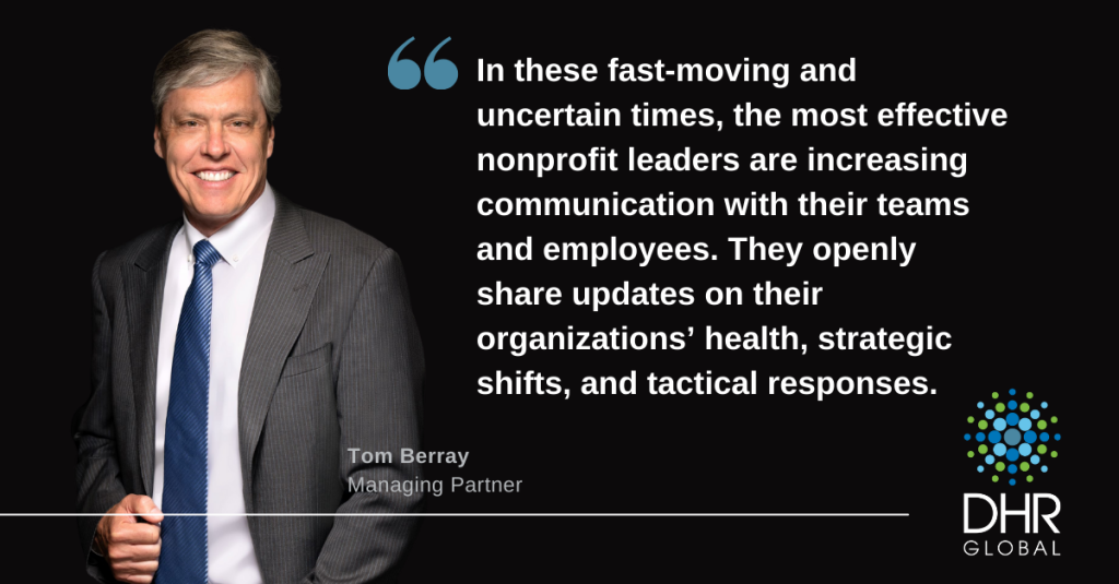 In these fast-moving and uncertain times, the most effective nonprofit leaders are increasing communication with their teams and employees. They openly share updates on their organizations’ health, strategic shifts, and tactical responses. They also prioritize direct check-ins, listening firsthand to gauge morale rather than relying solely on secondhand reports. Most importantly, they provide a clear vision and framework for moving forward – focusing on what they can control while avoiding promises they may not be able to keep.