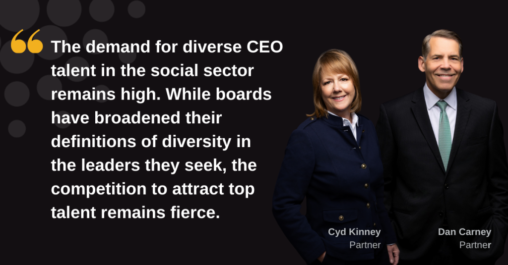 The demand for diverse CEO talent in the social sector remains high, especially following retirements and other post-pandemic influences. While boards have broadened their definitions of diversity in the leaders they seek, the competition to attract top talent remains fierce.
