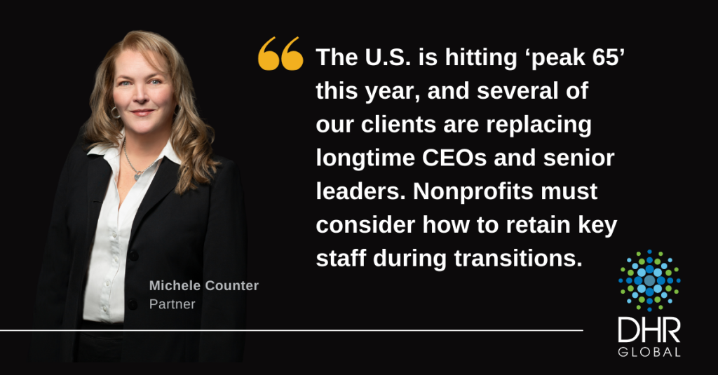 The U.S. is hitting “peak 65” this year, and several of our clients are replacing longtime CEOs and senior leaders who are retiring. Fortunately, many nonprofits saw this coming and began succession planning years ago. But succession planning involves more than assessing internal talent and developing future leaders. Nonprofits must also consider how to retain key staff during transitions as well as when and how to launch an executive search.