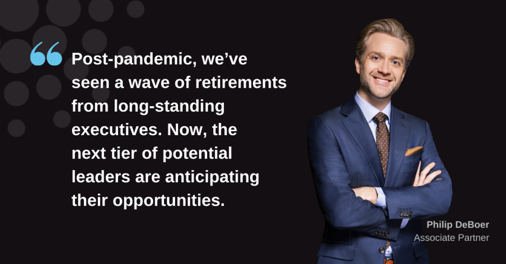 Post-pandemic, we’ve seen a wave of retirements from long-standing executives. Now, the next tier of potential leaders are anticipating their opportunities. As a result, we’re seeing a significant uptick in applications from internal candidates, which often poses delicate implications for both the employee and employer.