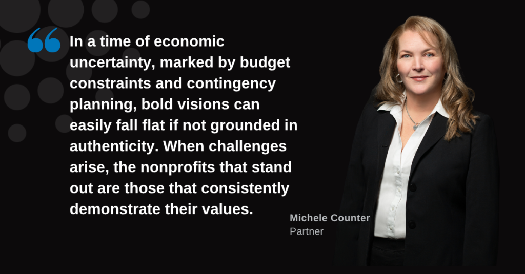 In a time of economic uncertainty, marked by budget constraints and contingency planning, bold visions can easily fall flat if not grounded in authenticity. When challenges arise, the nonprofits that stand out are those that consistently demonstrate their values. They continue to invest in staff development, cultivate inclusive leadership, and prioritize employee well-being. This sustained commitment to culture resonates deeply with purpose-driven professionals and helps organizations distinguish themselves in a competitive talent market.