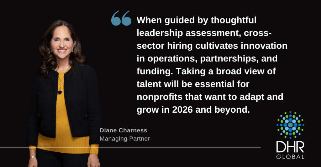 When guided by thoughtful leadership assessment, cross-sector hiring cultivates innovation in operations, partnerships, and funding. The goal isn’t to replace nonprofit expertise but to complement it – blending experience and insight to advance the mission effectively. Taking a broad view of talent will be essential for nonprofits that want to adapt and grow in 2026 and beyond.
